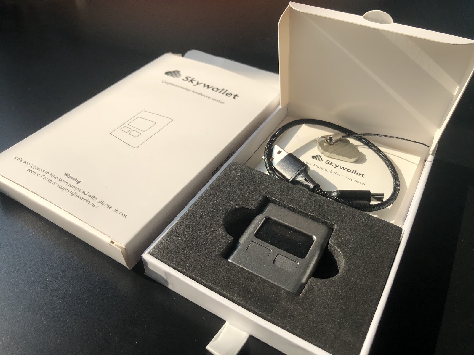 Skywallet’s final design consists of a UI screen, two buttons and a micro USB 2.0 port. It’s packaged in a minimalist, stylish box and comes with an instruction manual, micro-USB 2.0 to USB cable, and a keychain.